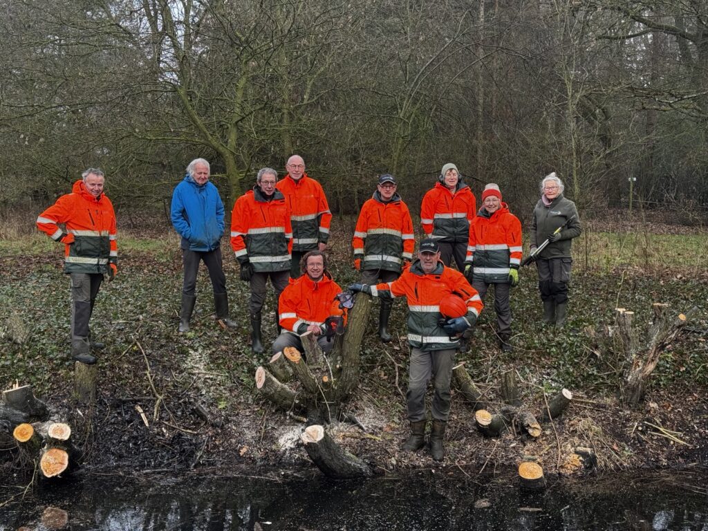 Ploeg vrijwilligers steekt de handen uit de mouwen bij het door ons beheerde terrein De Wieske. De poel is vrijgezet van begroeiing, zodat de zonzijde weer beschikbaar is voor amfibieën om zich op te warmen.
